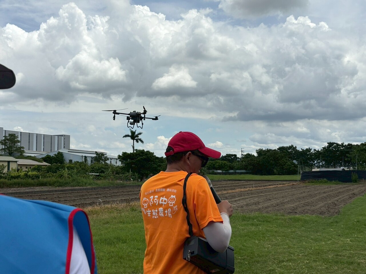 ▲老師示範農務專用無人機種玉米與噴益生菌