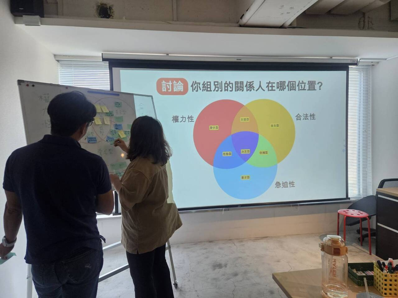 會議中,各組開始把手中的利害關係人貼到分類圖中,現場貼紙貼滿白板、討論熱烈~這次交流中,我們也一起分享發生衝突的情境如何解決,透過模型分類,我們逐漸釐清:「當衝突發生時,還可以參考屬性、權責與影響層級。」會議結束後,大家也透過協作連結把利害關係人名單貼到地圖中,未來這張利害關係人地圖,將協助我們在活動決策中的溝通順序更清楚、衝突處理更有依據、資源媒合更有效率~