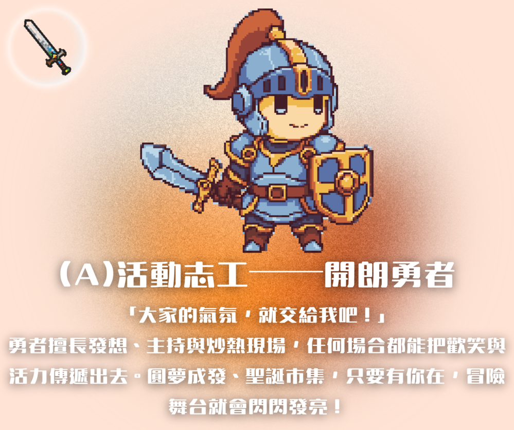 勇者擅長發想、主持與炒熱現場,任何場合都能把歡笑與活力傳遞出去。圓夢計畫成發、聖誕市集,只要有你在,冒險舞台就會閃閃發亮!