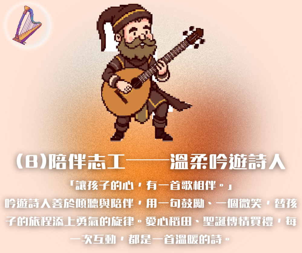 吟遊詩人善於傾聽與陪伴,用一句鼓勵、一個微笑,替孩子的旅程添上勇氣的旋律。愛心稻田、聖誕傳情陪買禮物,每一次互動,都是一首溫暖的詩。