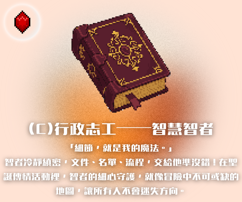 智者冷靜縝密,文件、名單、流程,交給他準沒錯!在聖誕傳情活動裡,幫孩子買禮物、挑禮物、包裝分類禮物等,智者的細心守護,就像冒險中不可或缺的地圖,讓所有人不會迷失方向。