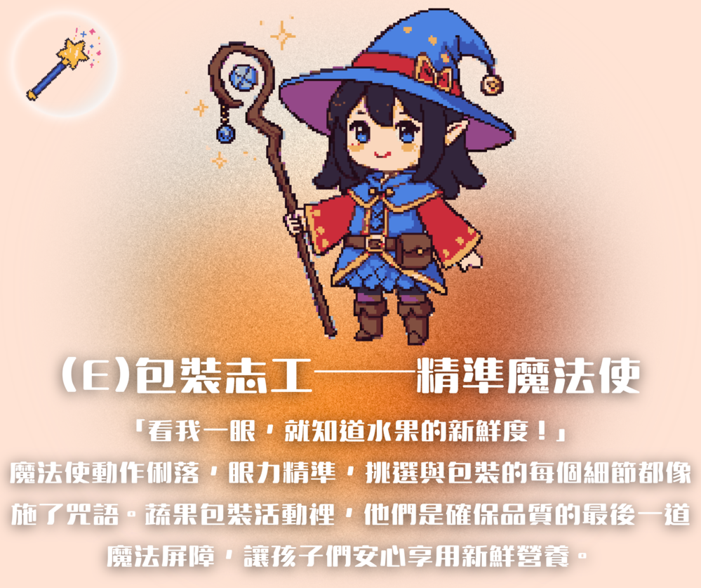 魔法使動作俐落,眼力精準,挑選與包裝的每個細節都像施了咒語。蔬果包裝活動裡,他們是確保品質的最後一道魔法屏障,讓孩子們安心享用新鮮營養。