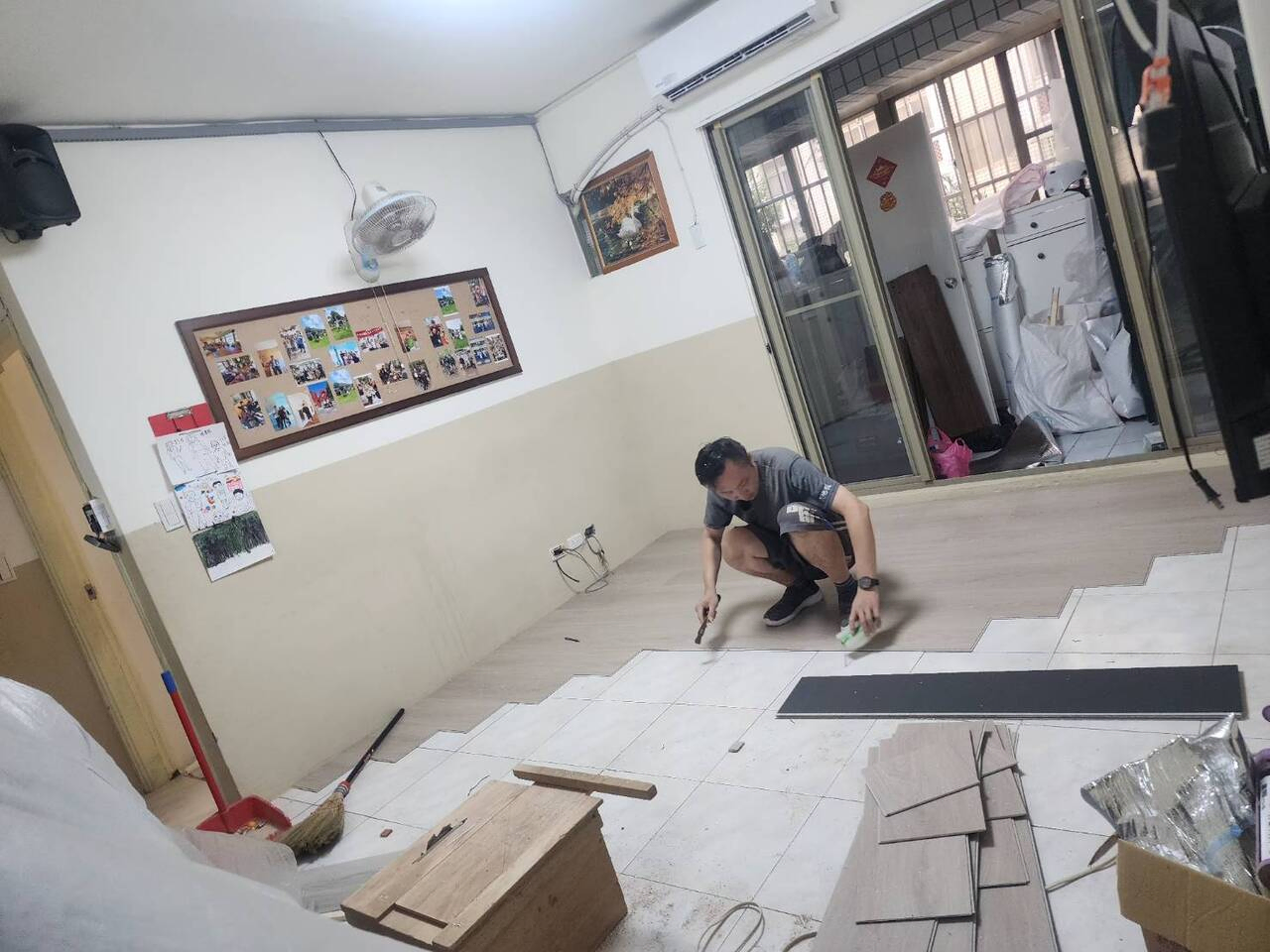 ▲榯榯設計加入工程公益修繕,鋪設的木質地板及油漆施作中。