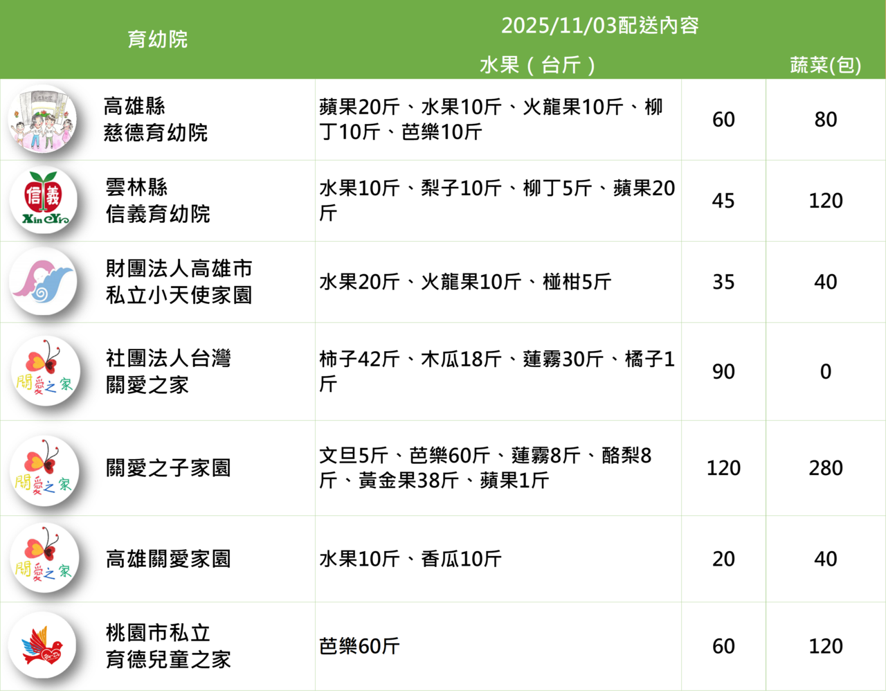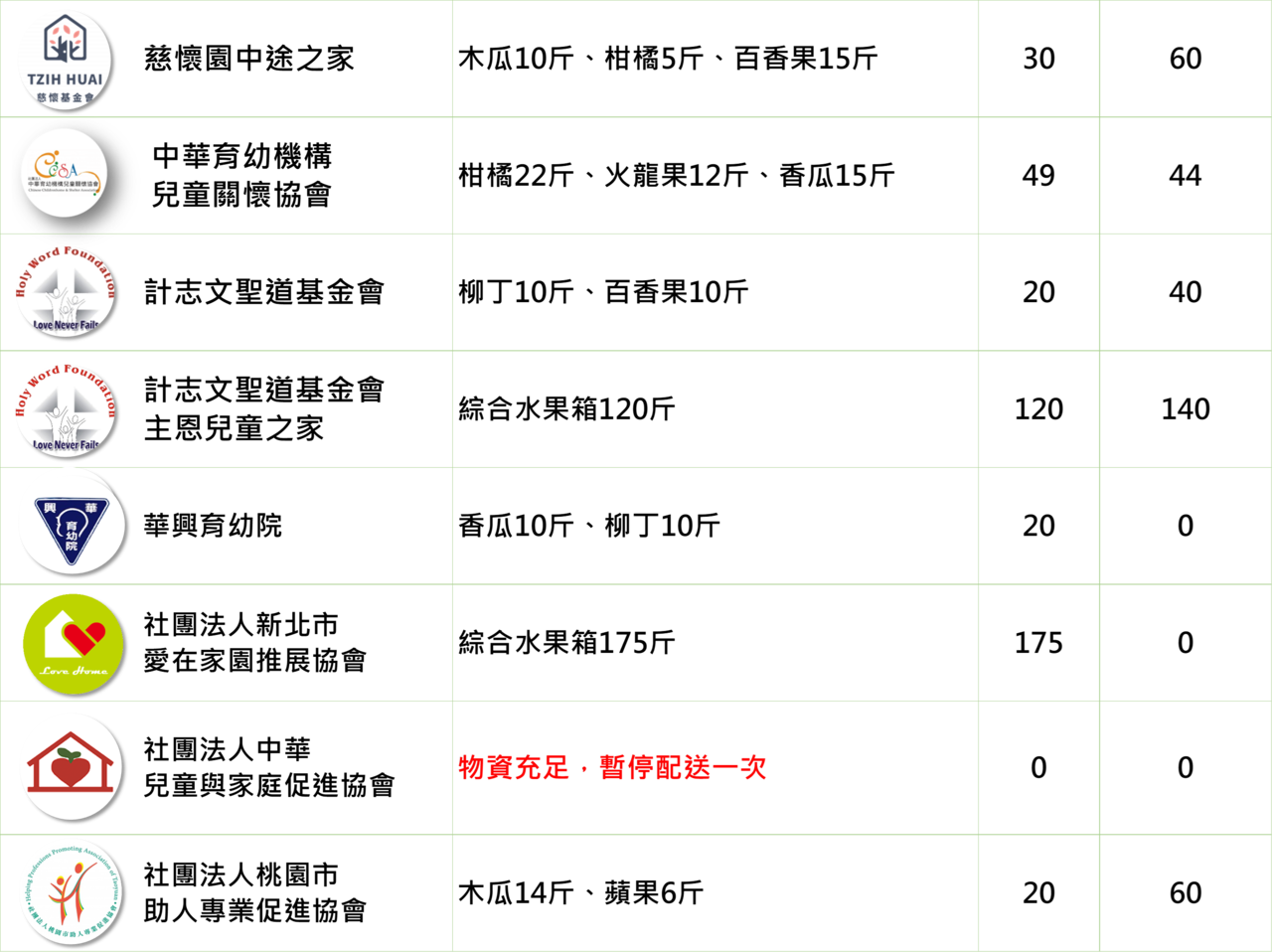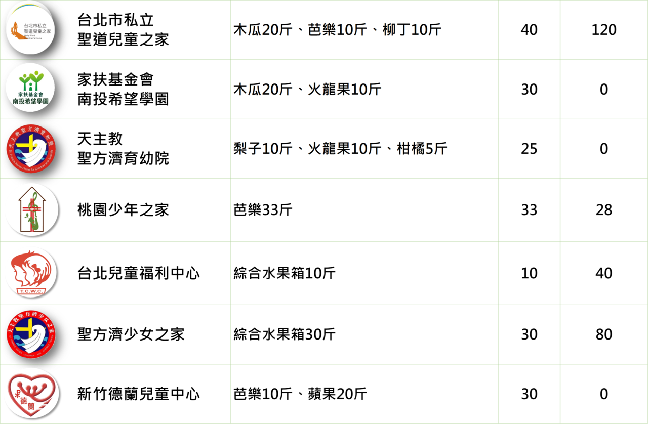 提供48間育幼院/安置機構一週所需的蔬果,陪伴育幼院孩子健康長大!本週配送品項有: