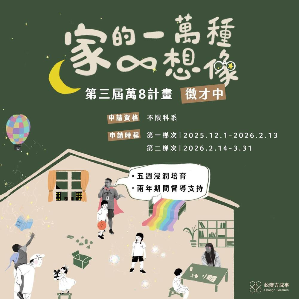 蛻變方成事致力於提升逆境兒少照顧品質,成為安置兒少照顧者的後盾,近期「萬8計畫」徵才開跑!如果你也曾在關心逆境兒少的過程中,想過:「我還能多做些什麼?」,誠摯邀請你加入萬8計畫,一起成為安置兒少生命中重要的生命教練。