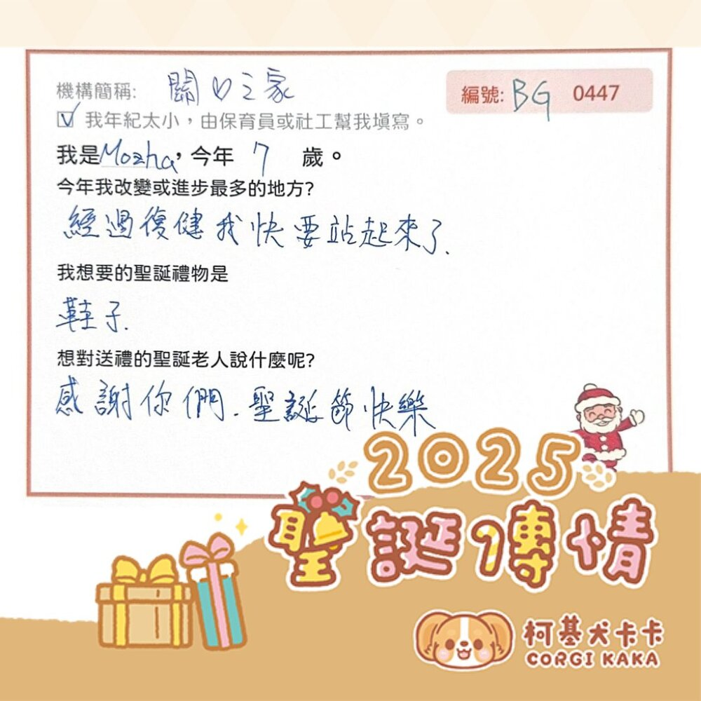 【2025聖誕傳情】889份禮物背後的故事:笑中帶淚的聖誕小卡今年,我們為全台育幼院孩子募集了889份聖誕禮物,每一張心願小卡背後,都藏著孩子最真誠的期待與故事。當中最讓人鼻酸的是來自關愛之家、7歲的Mozha在卡片上寫著:「經過復健我快要站起來了。」