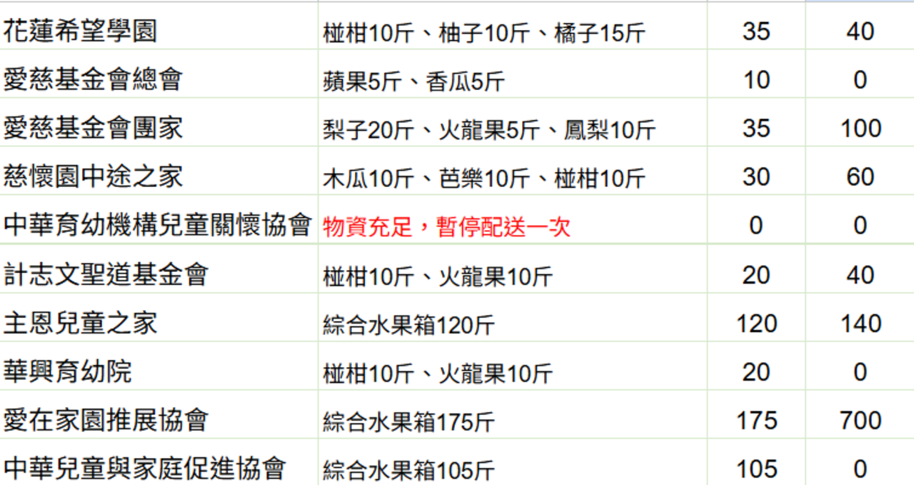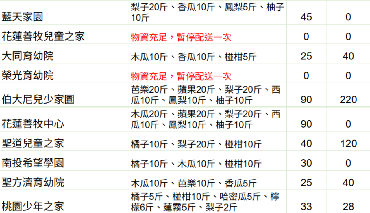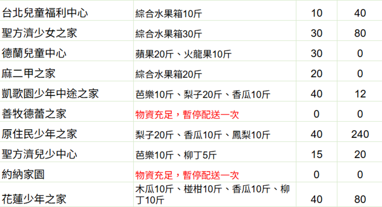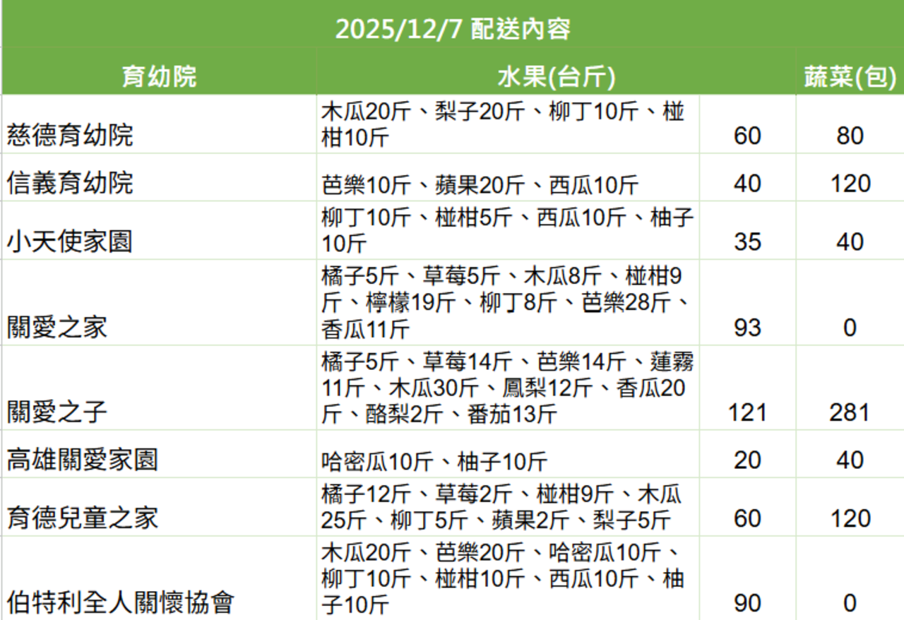 提供48間育幼院/安置機構一週所需的蔬果,陪伴育幼院孩子健康長大!本週配送品項有: