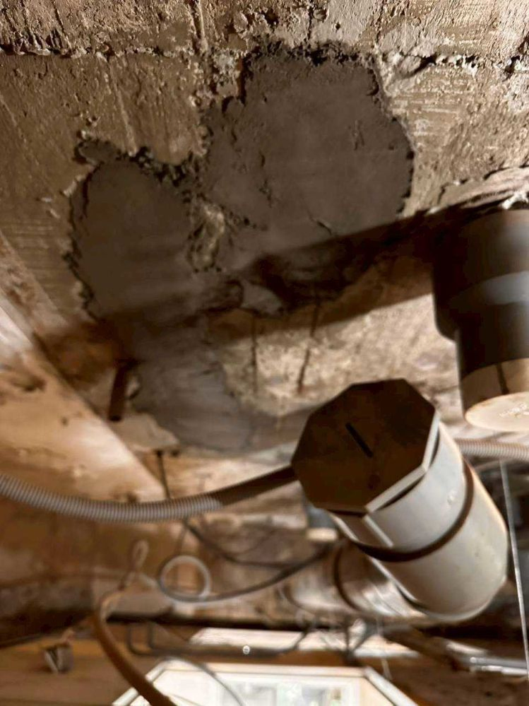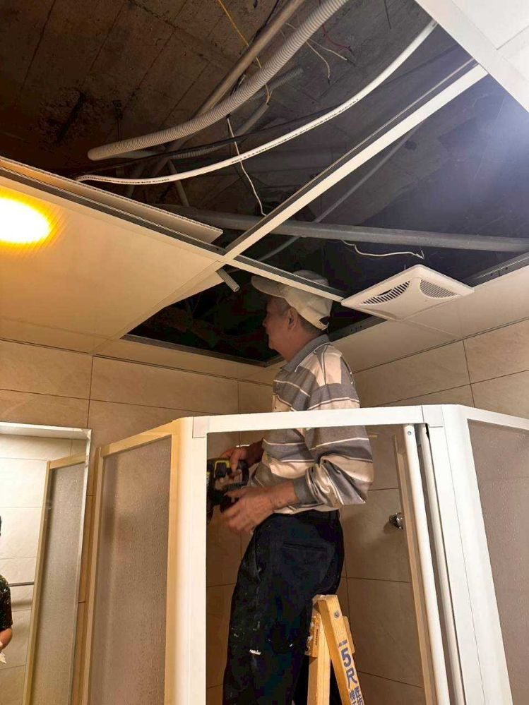 來到台北兒童福利中心,這裡曾經面臨著另一種嚴峻的考驗。長期以來,浴廁天花板因為潮濕氣候的侵蝕,出現了嚴重的結構問題。在四樓及三樓的小家,共計10間浴廁裡,輕鋼架內部的天花板早已不堪重負。水泥牆面被濕氣侵蝕剝落,甚至露出了生鏽的鋼筋。