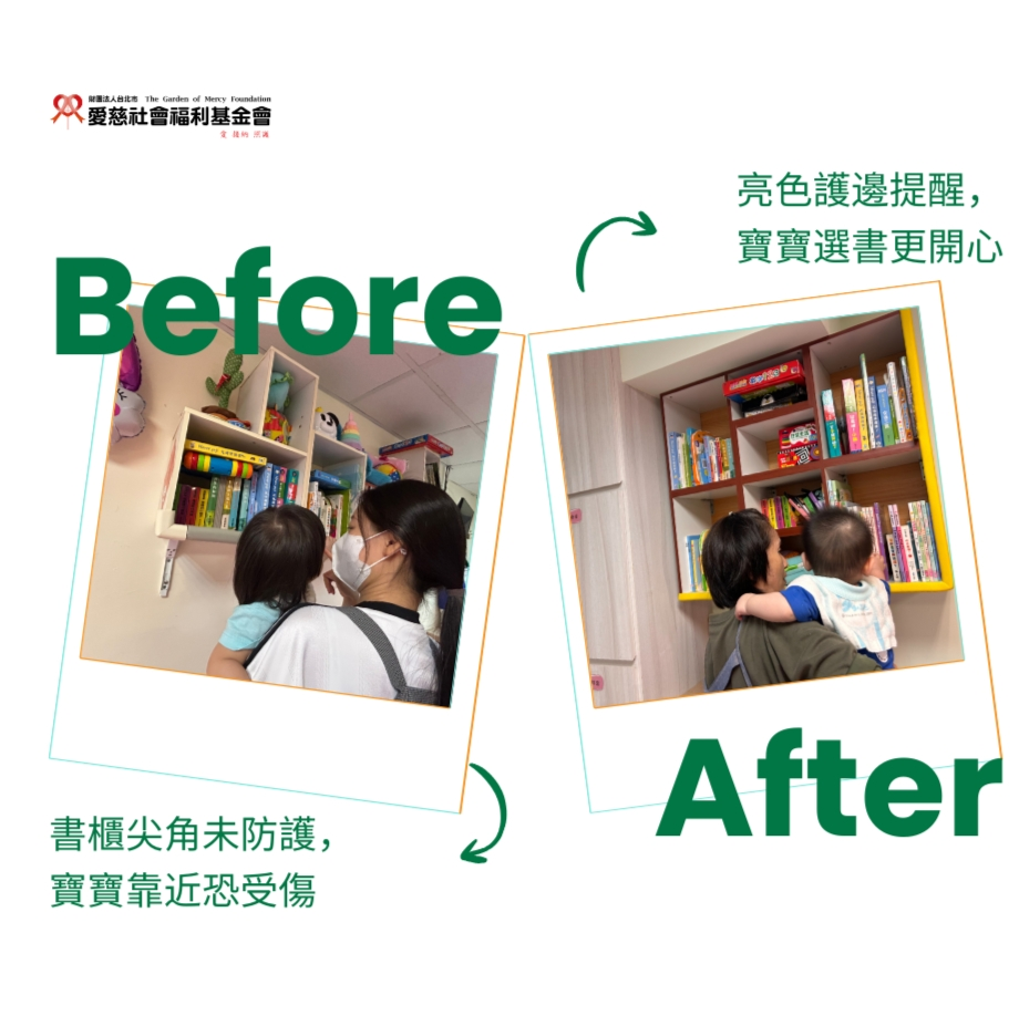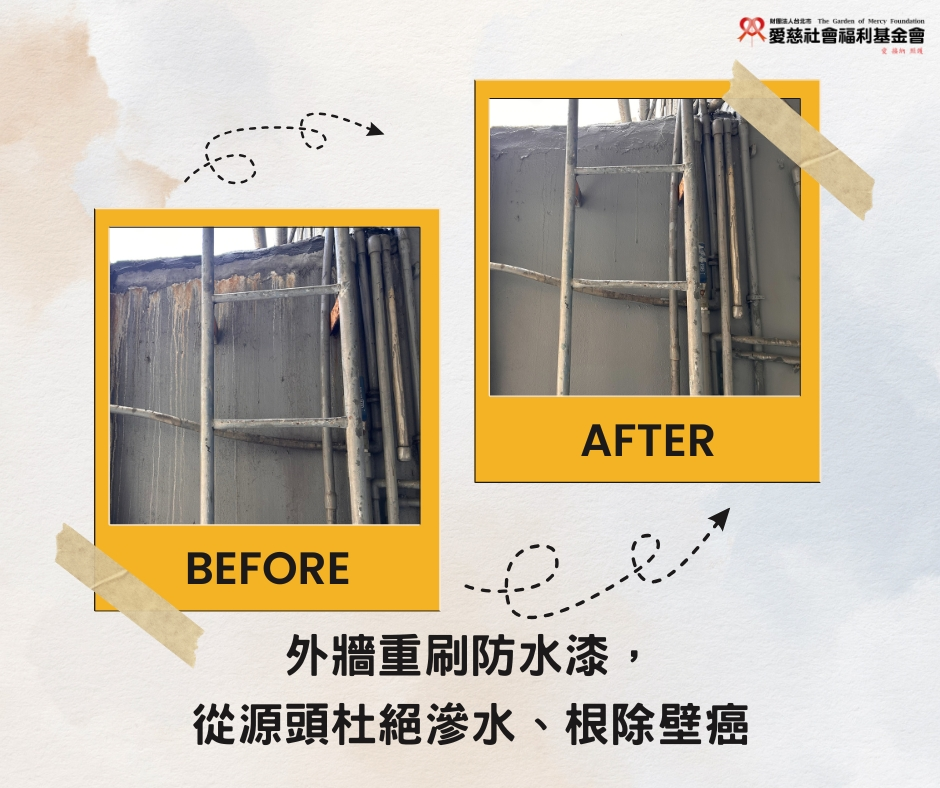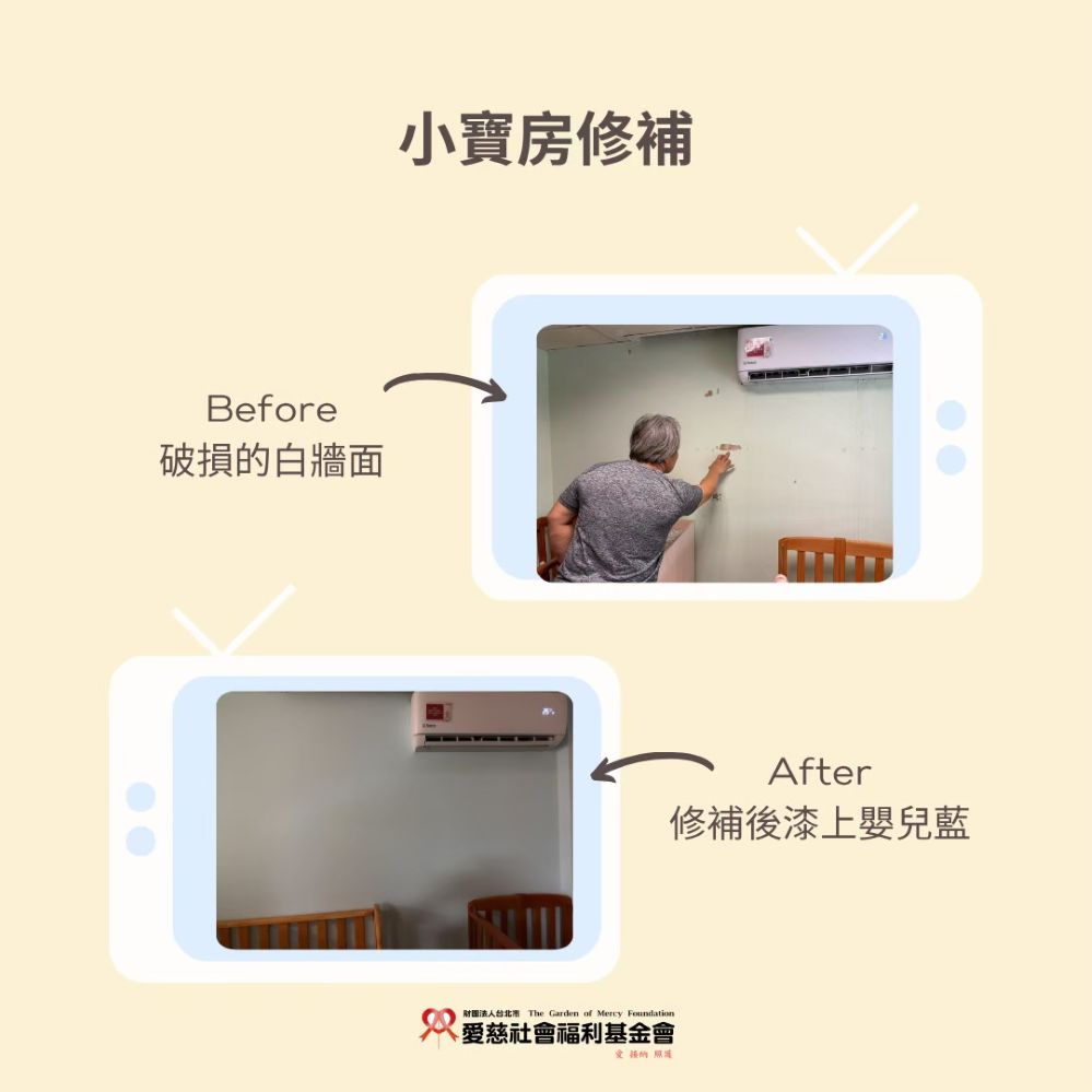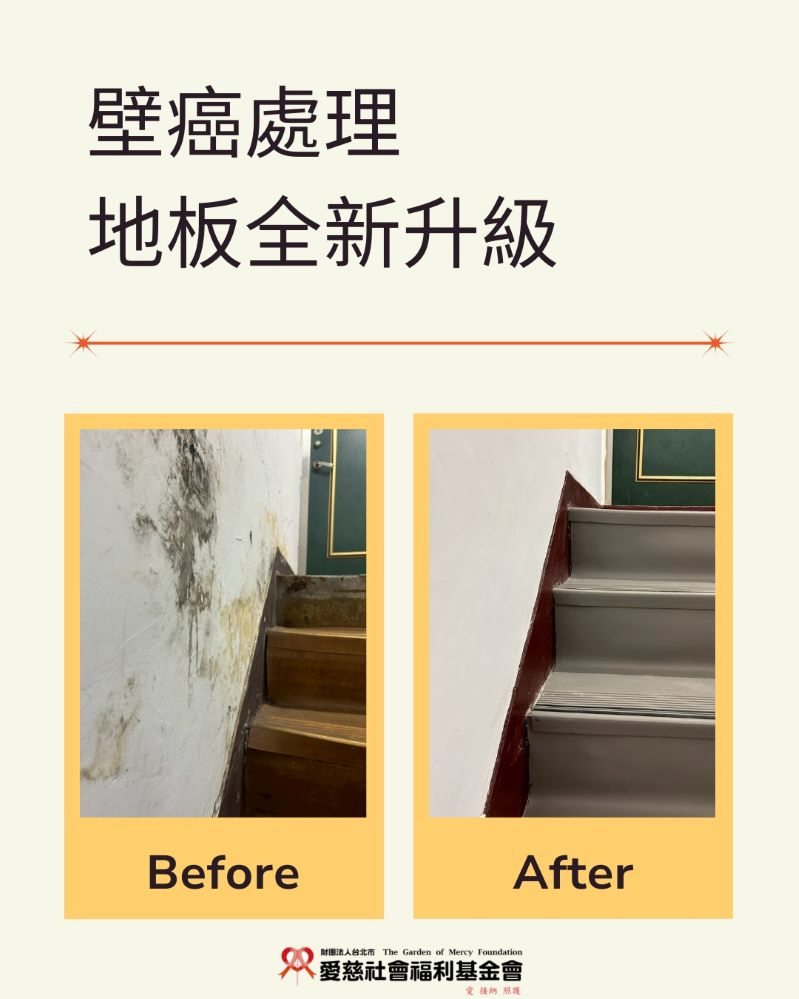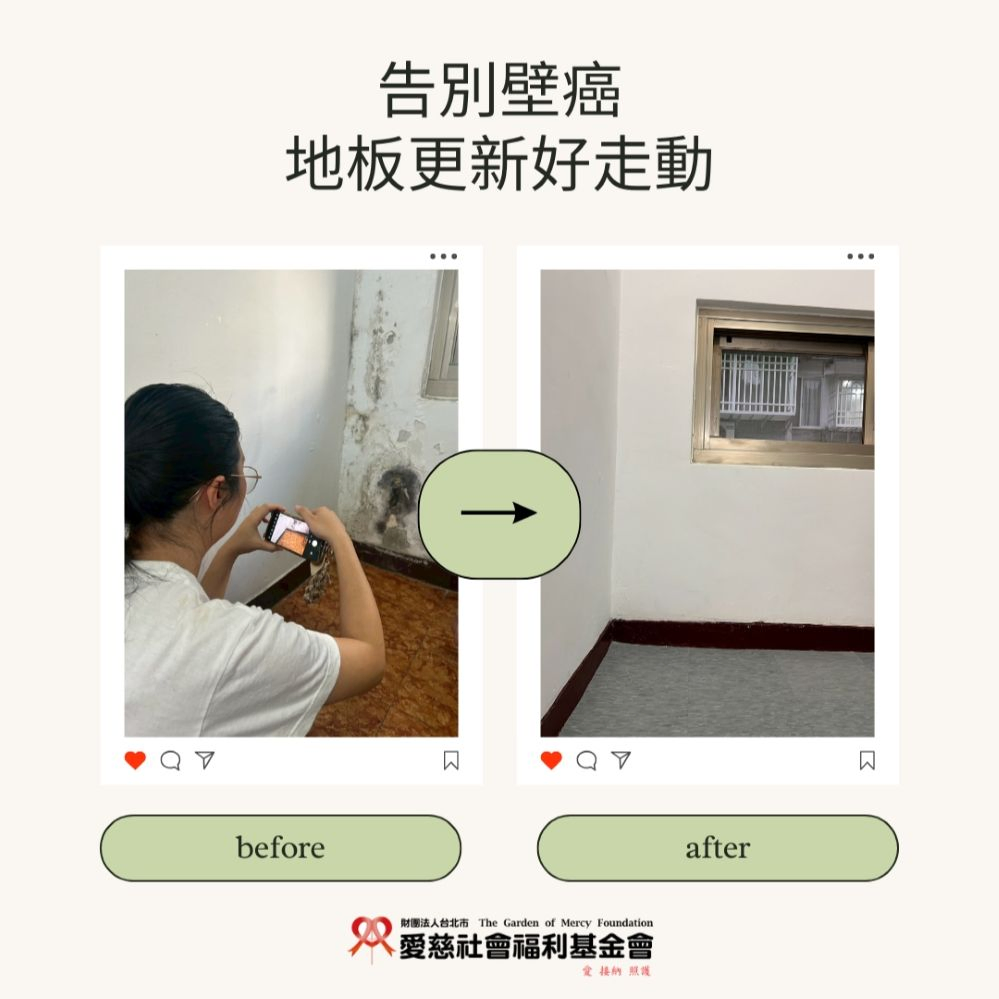 如今,當嶄新的地板鋪設完成,當潔白的牆面不再有霉斑,愛慈的寶寶們終於迎來了一個煥然一新的家。這不僅是硬體的更新,更是為他們擋住了病菌與危險,讓他們能像普通孩子一樣,擁有一個可以安心呼吸、安全學步的成長空間。