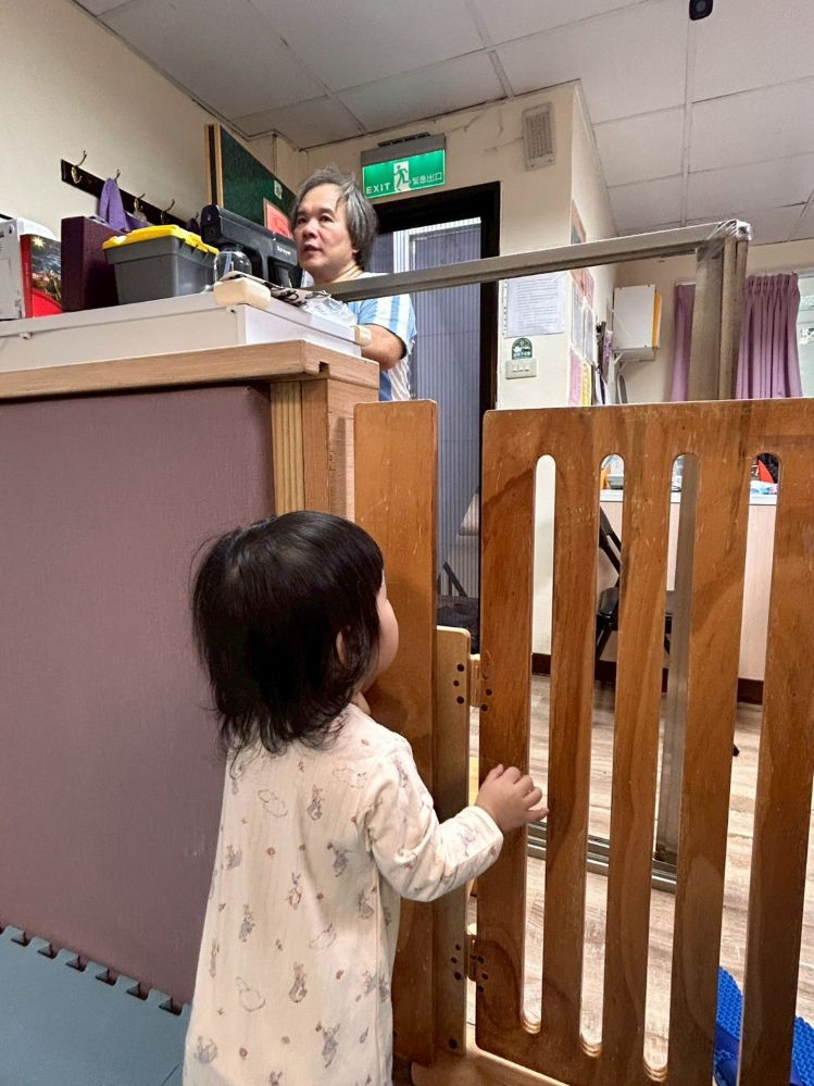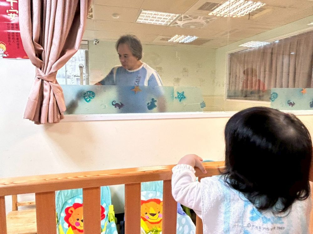 ▲愛慈基金會寶寶好奇看著施工中的師傅