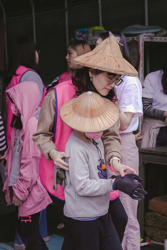 在下田前,志工細心替孩子戴上斗笠,陪伴著孩子走入田間,一起去看看大家親手種下的地瓜。