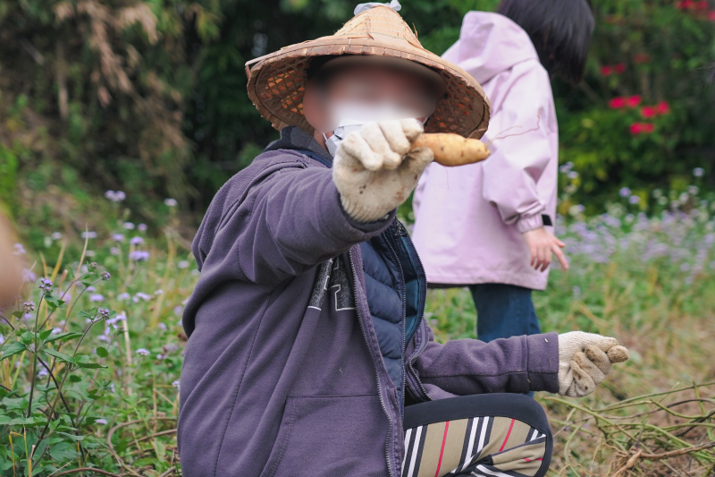 挖地瓜的過程中,孩子們幹勁十足。有的孩子負責鬆土、有的專心找地瓜的位置,有的則小心翼翼把地瓜從泥土中挖出來。志工陪伴在孩子身旁,提醒孩子如何用力才不會傷到地瓜,也注意濕滑的泥土避免跌倒。孩子們常常一挖到地瓜就興奮地大喊:「我挖到了!」迫不及待拿給志工或攝影師看,臉上滿是驕傲。