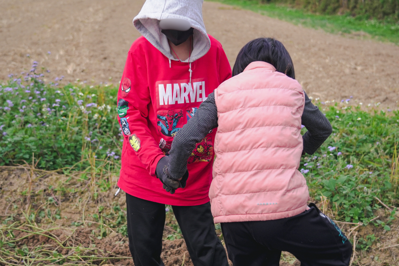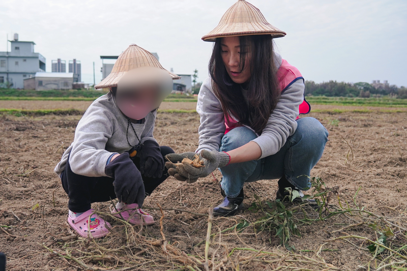 孩子之間也自然形成合作關係,有人幫忙扶著同伴,有人提醒「這裡滑滑的要小心」,在田間互相照顧。農事活動不只是勞動,也讓孩子學會合作與互助的珍貴經驗。