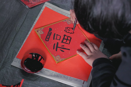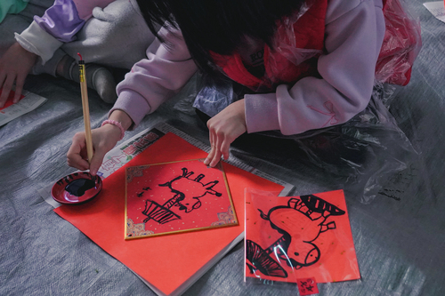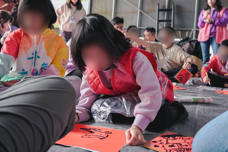 最後一個活動,是年前特別安排的新春體驗——春聯創作。我們邀請書法老師來到農場與大家一起畫春聯。孩子們對於能創作屬於自己的春聯都相當期待,在創作過程中非常投入。志工細心觀察孩子衣服是否會沾到墨汁,貼心替孩子調整圍裙。