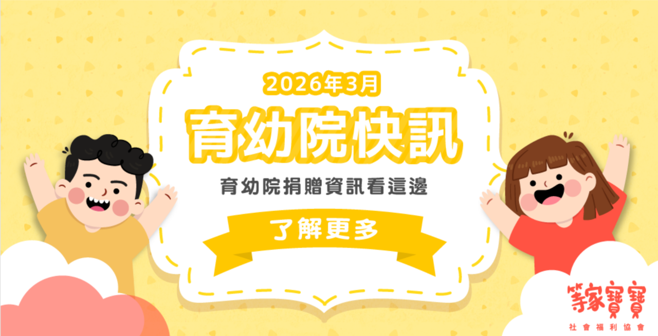 每個月,等家寶寶協會都會整理育幼院的需求與近況,透過「育幼院快訊」讓更多人看見孩子的生活樣貌與實際需要。2026年3月的快訊中,分享了各家兒少安置機構的最新消息與需求,包括生活物資、學習資源與陪伴支持等。透過這樣的資訊整理,也讓關心孩子的夥伴能更即時地了解如何參與、如何幫助,讓支持更精準地送到孩子身邊。