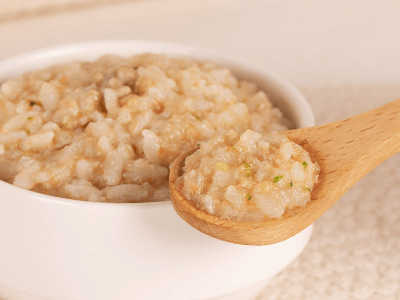 - 質地:水分更少、顆粒感更明顯的粥(如:四倍粥)