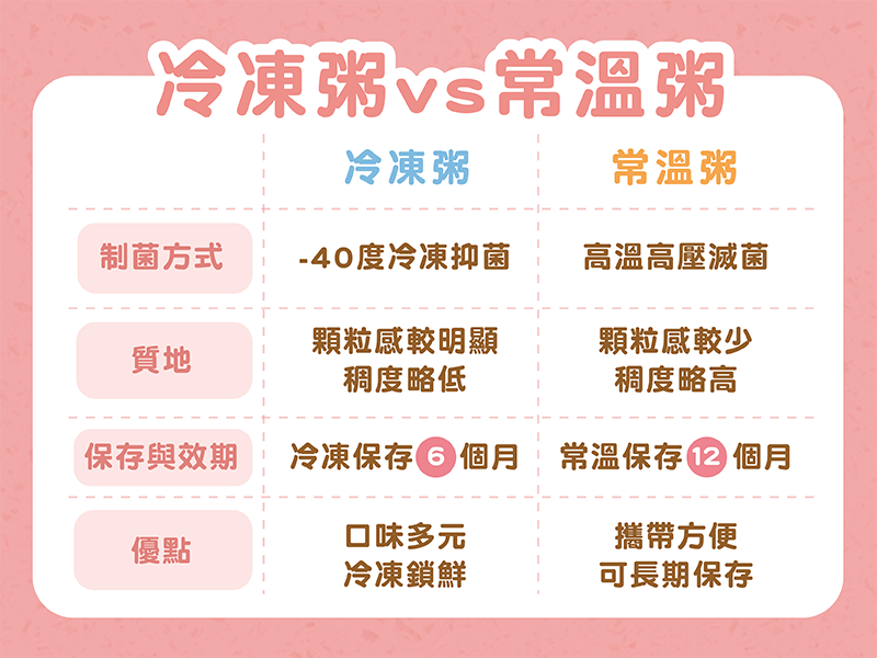 - 常溫粥: 適合常有旅遊、外出需求、家裡冰箱空間有限,或想作為家中長期備糧的爸媽