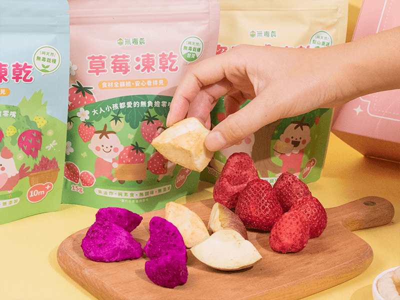 ▲ 水果凍乾由低溫烘乾技術製成,保留食物原味與營養,大塊輕脆,適合寶寶抓握食用(圖/無毒農粥寶寶)