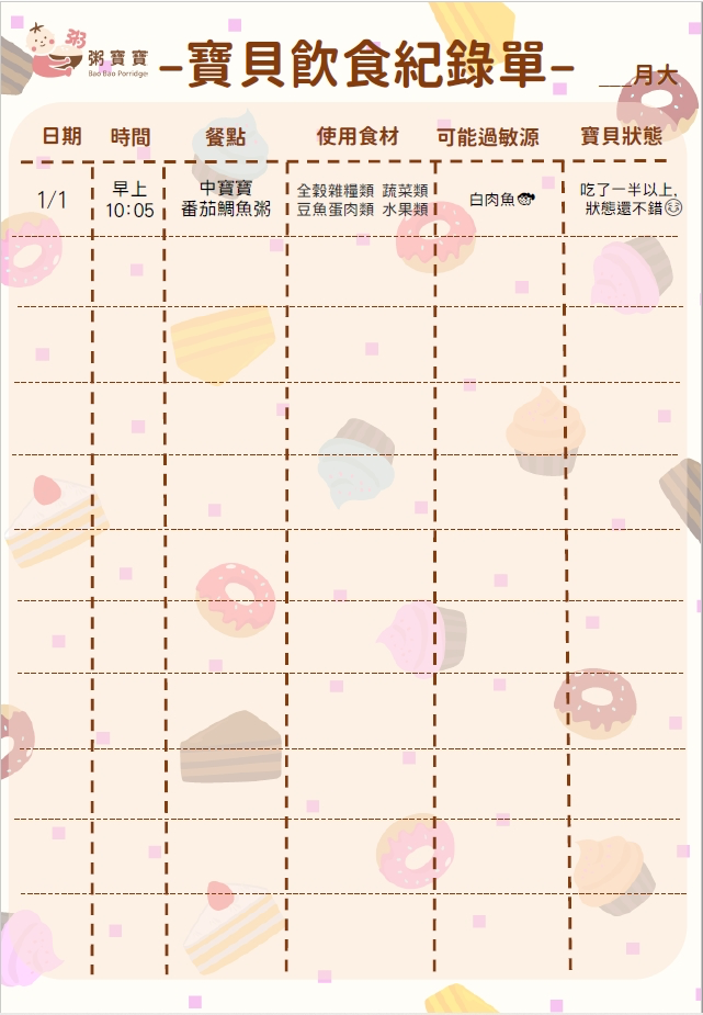 爸比媽咪們可以藉由「寶寶飲食紀錄表」記下寶寶哪天吃了甚麼,並留意寶寶對易過敏的食材反應如何,做紀錄也有利於安排一週菜單,避免重複吃同一道料理,造成偏食的問題,更能進而了解寶寶的過敏食物是什麼呦!歡迎存起來及分享給有同樣需求的爸比媽咪吧!