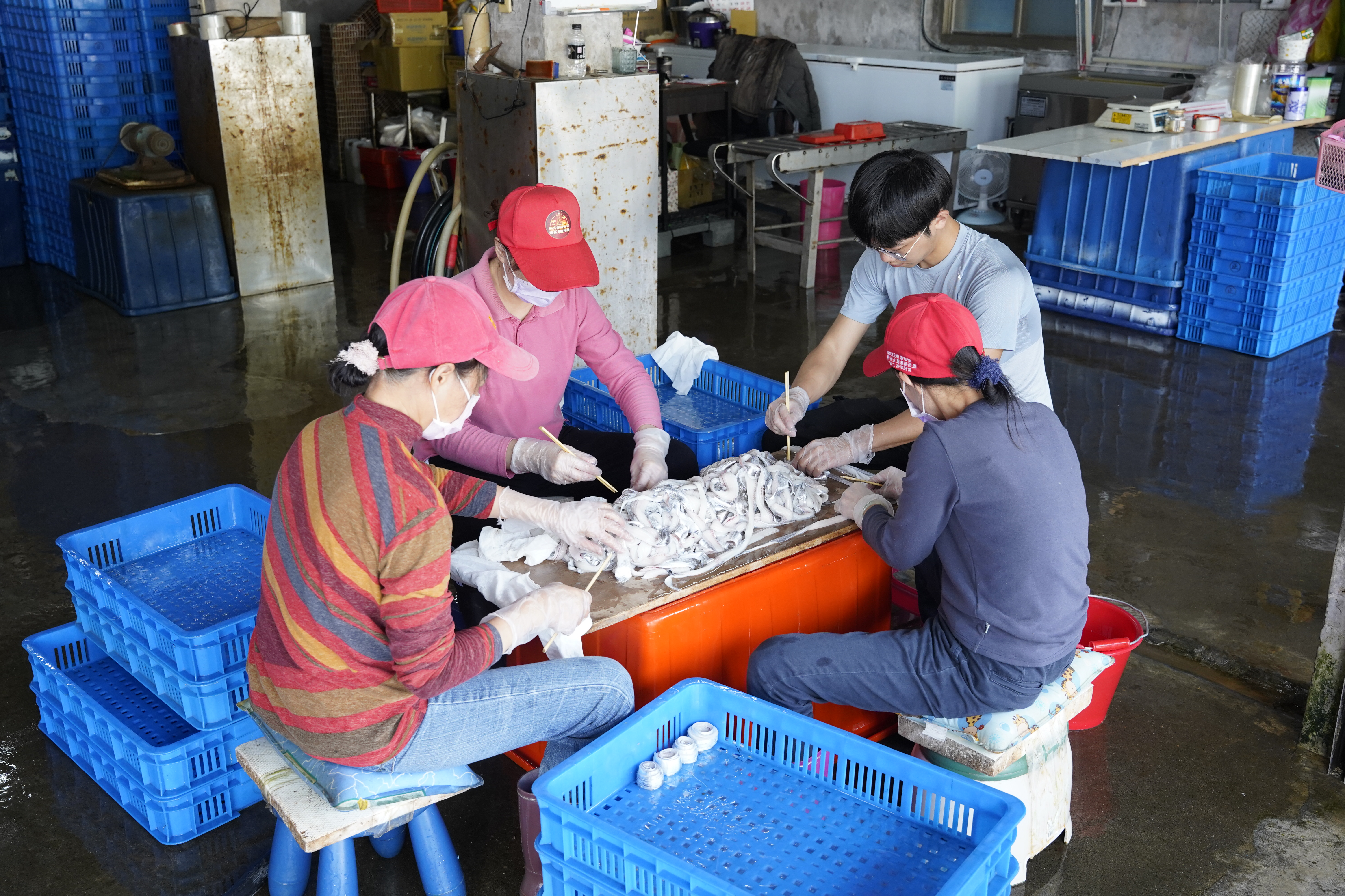 看著弘笙如此熟稔地掌控工作現場所有狀況,完全感受不出他才回家與爸媽共事一年多而已,他羞赧地回覆可能是從小耳濡目染之故。▲跟著爸爸創立的榮成海鮮一起長大的弘笙(右二)(圖/蘇澳好物)