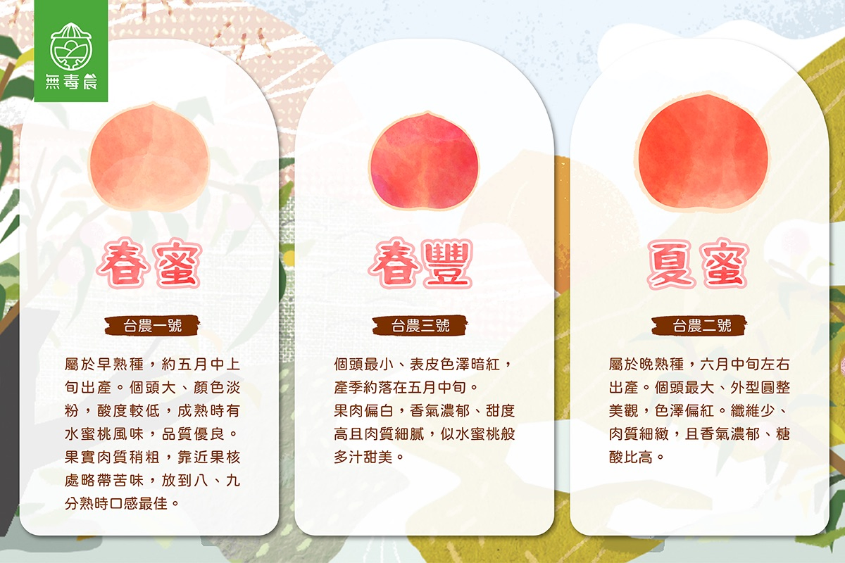 先幫大家科普一下「五月桃」的身世,五月桃其實是五月出產的平地水蜜桃的泛稱,其中包含了許多近似品種,農友在栽種的時候基本上不會只種植單一品種, 而不同品種的桃樹有時栽種距離過近,造成「混種」的情形發生,也因此在以外觀粗略分辨品種時並無法很精確的辨別是何種品種。