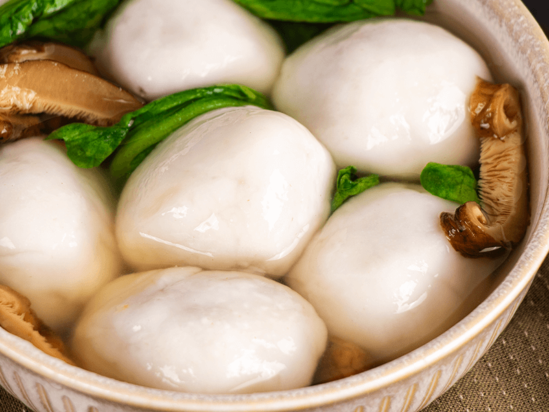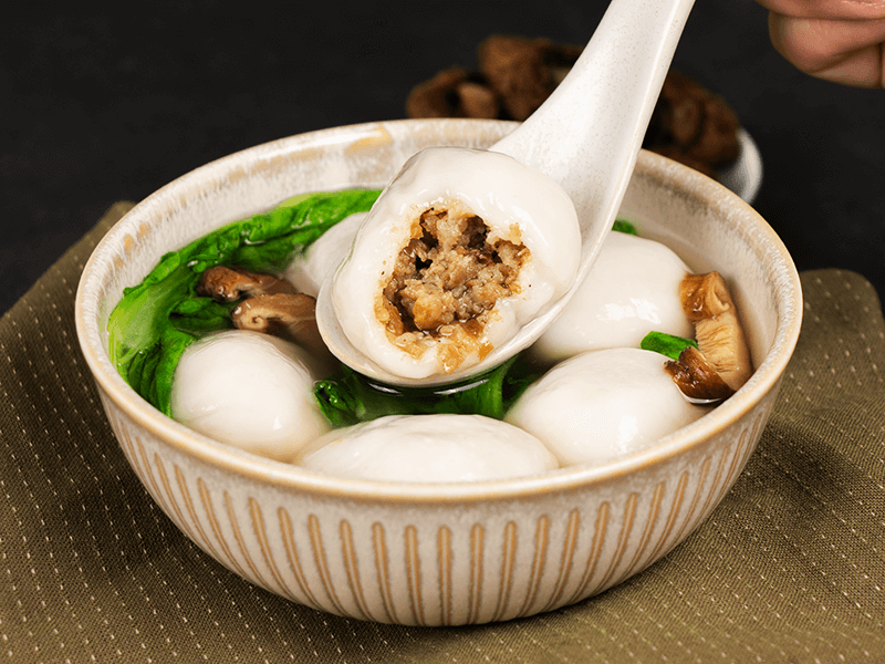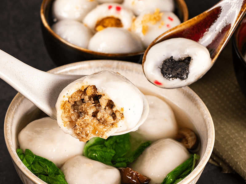 •鮮肉湯圓的餡料炒製更是一絕,紅蔥頭經手工剝皮、切片、手工翻炒製金黃色後,續再加入台灣本國生產溫體豬絞肉、鹽、胡椒等調味料炒製而成。