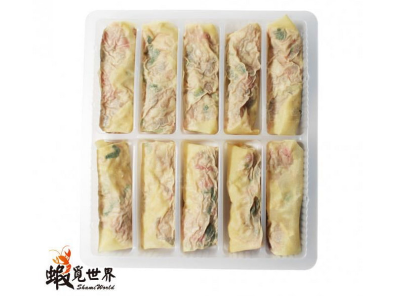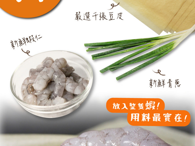 成 份:白蝦仁、豬肉(台灣)、荸薺、蔥、豆皮(非基改黃豆、水、 甘油、大豆蛋白(非基因改造)、豆類消泡劑(脂肪酸甘油酯、 卵磷脂、碳酸鎂、矽樹脂)鹽)、麵粉 、薑、糖、鹽、 胡椒粉