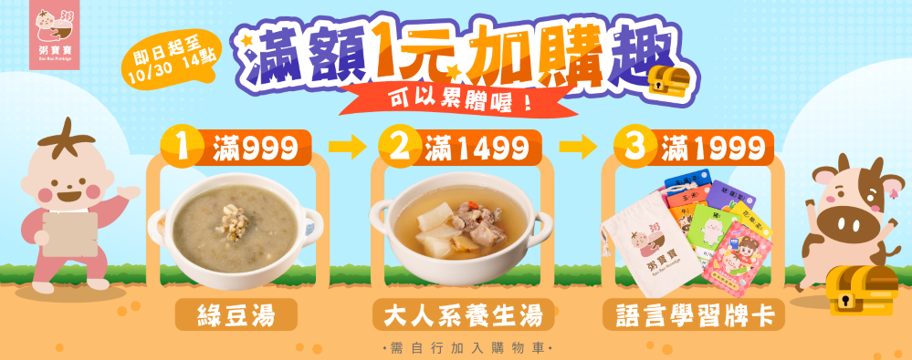 ※粥寶寶冷凍商品金額滿$999,享1元加購「蓮子薏仁綠豆湯1包」,須自行加入購物車。