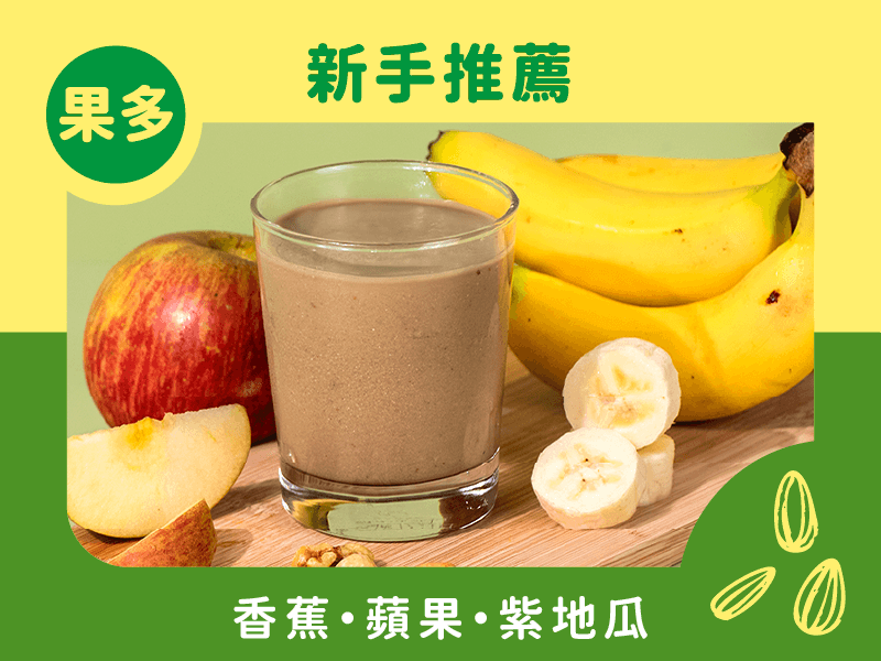成分:水、香蕉、蘋果、紫地瓜、綠花椰菜、荷葉白菜、青松菜、米蛋白、甘藍、玉米筍、杏仁粒、腰果、夏威夷豆、胡桃