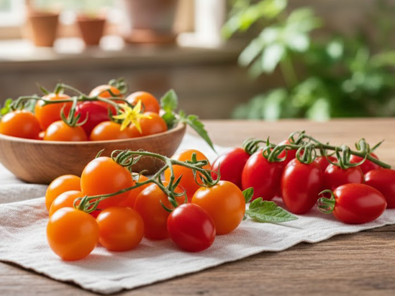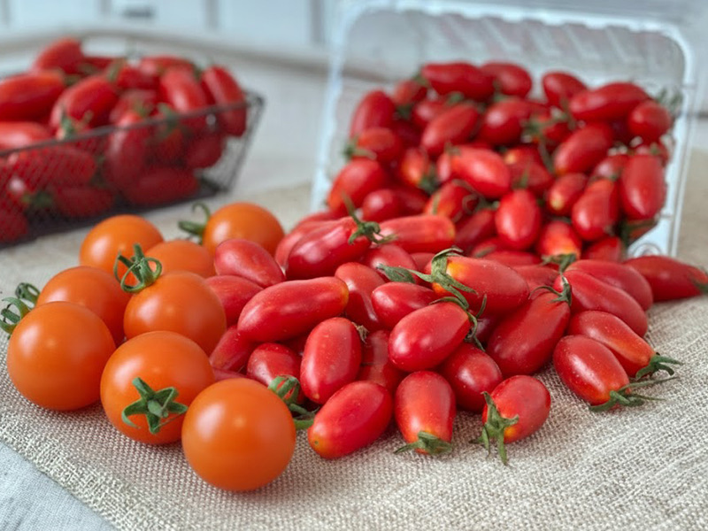 當季出貨的「紅色小番茄」會採 混搭出貨:裡面可能同時有新品種 蜜媞番茄,也可能搭配經典的 小女番茄。兩種都是紅潤討喜、甜味自然的小番茄,但口感各有亮點——