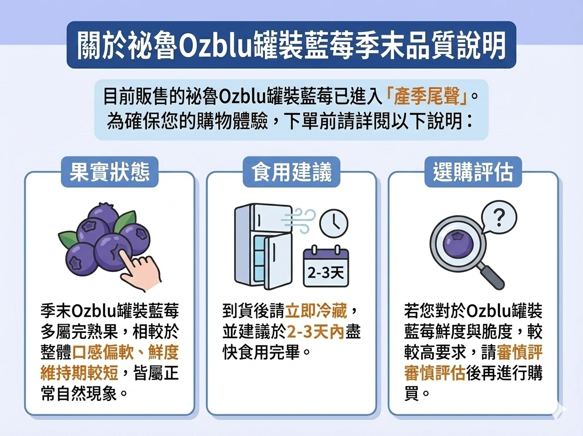 目前販售的祕魯藍莓已進入「產季尾聲」,為確保您的購物體驗,下單前請詳閱請參考規格說明。