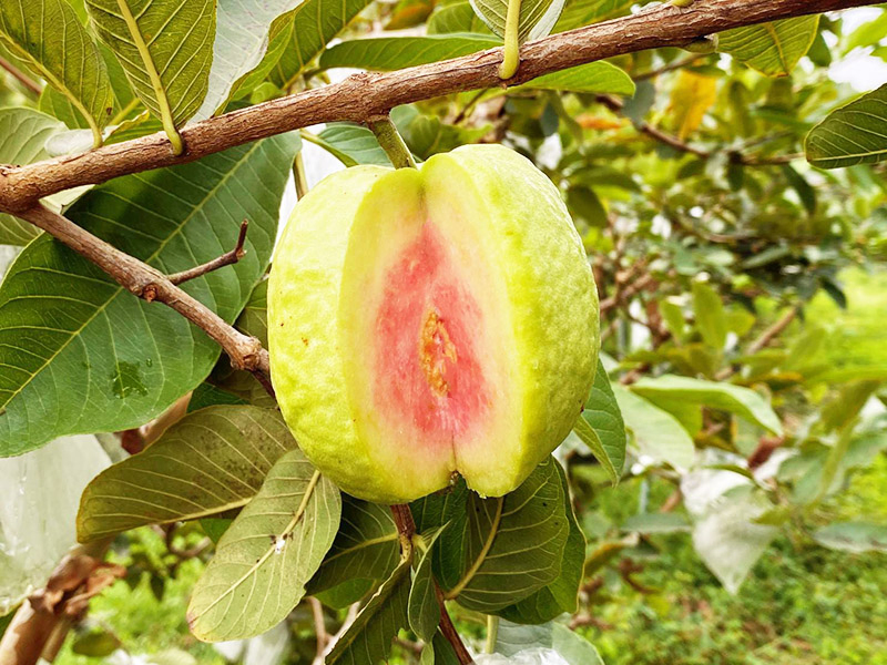 紅鑽石芭樂是源自台灣的特殊品種,以其深紅如寶石般的果肉與翠綠外皮形成鮮明對比。相較於傳統紅心芭樂,它的紅色分布更為均勻,具備少籽、肉質細緻、口感清脆等優點。其風味在酸甜之間達到完美平衡,幾乎沒有澀味,咀嚼時更散發出一股獨特且淡雅的「花果清香」,無論是纖維質的豐富度或整體的層次感,皆屬芭樂中的高端之作。