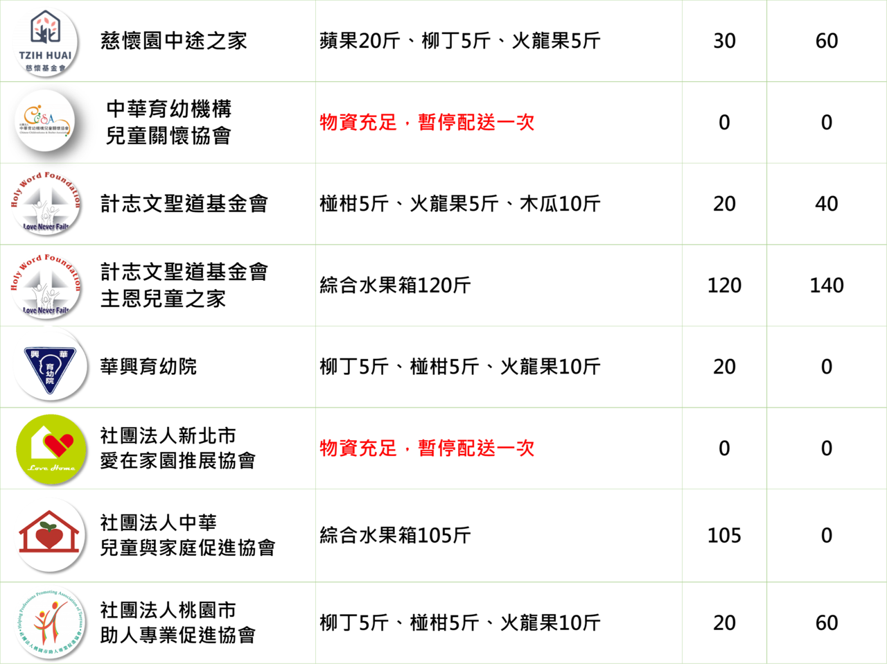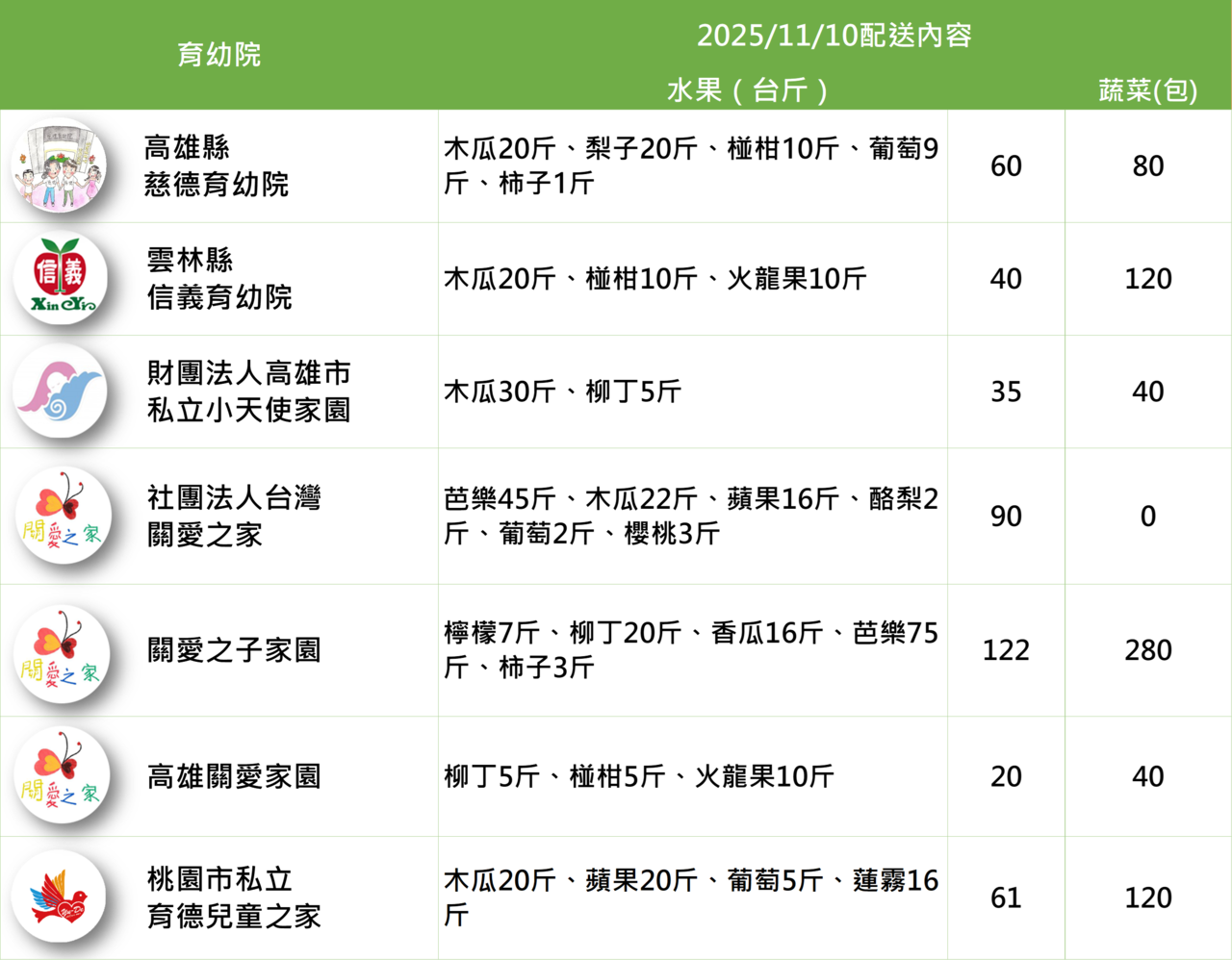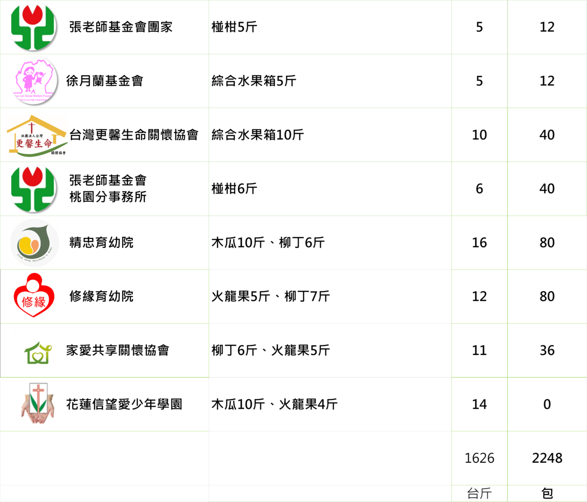提供48間育幼院/安置機構一週所需的蔬果,陪伴育幼院孩子健康長大!本週配送品項有: