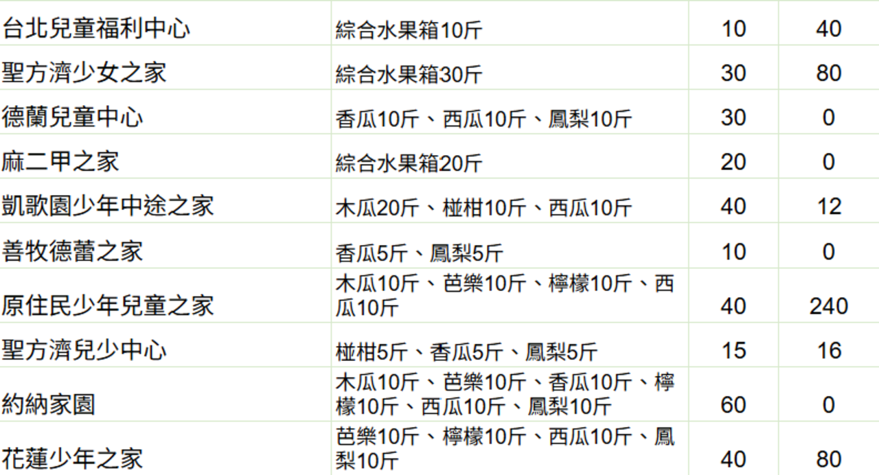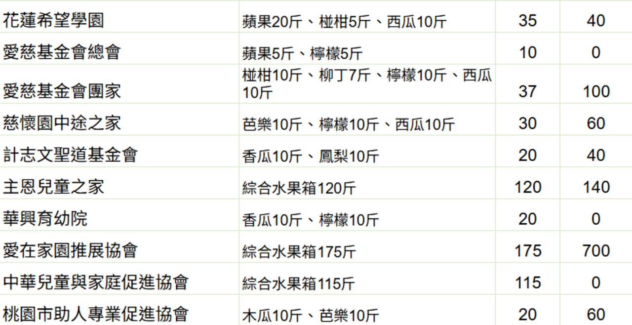 提供48間育幼院/安置機構一週所需的蔬果,陪伴育幼院孩子健康長大!本週配送品項有: