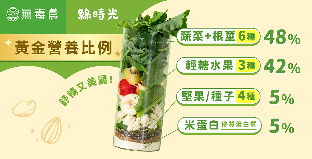 根據無毒農的定義,綠拿鐵是一種以蔬菜為基底,加入水果、蛋白質、堅果或種子等食材,透過調理機攪打而成的營養飲品。