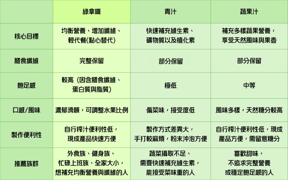 下表經過團隊實測,整理了市面上三種常見綠色飲品的特性,從營養成分、纖維含量、飽足感到便利性,幫助你快速比較誰最適合你的生活需求。