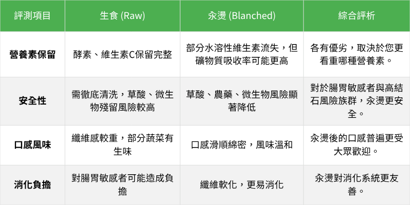 妍臣營養師與多數營養師建議,如果你是初學者、腸胃功能較弱或有結石體質,「先汆燙再製作」是更安全穩妥的入門方式。對於健康狀況良好的人,可以嘗試生食與汆燙交替使用,並多樣化攝取不同蔬菜,分散風險。