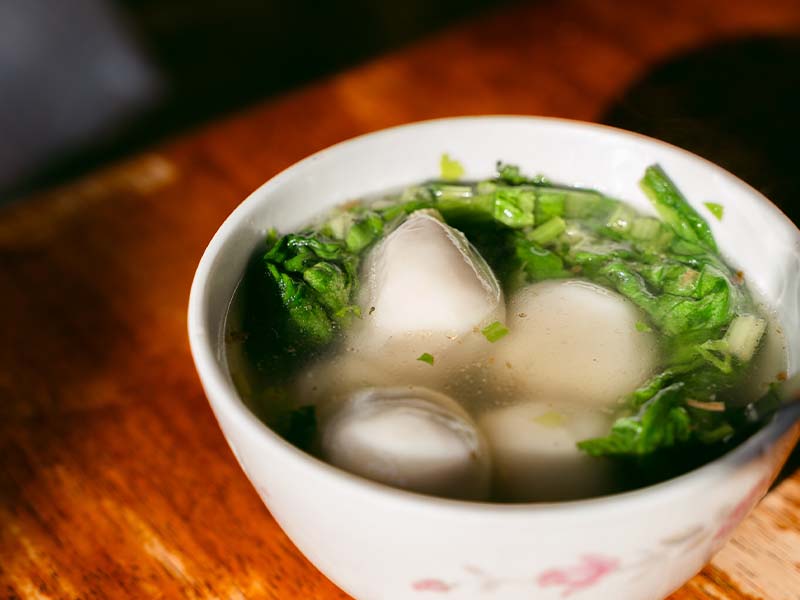 •鮮肉湯圓的餡料炒製更是一絕,紅蔥頭經手工剝皮、切片、手工翻炒製金黃色後,續再加入台灣本國生產溫體豬絞肉、鹽、胡椒等調味料炒製而成。