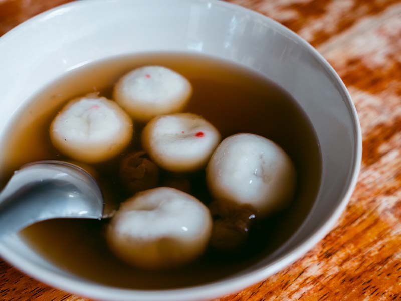 欣欣商號被封為台中必吃的三大湯圓之一,湯圓外皮採用水磨糯米,再將打散成小顆粒的脫水粿「粞」(tshè),再加入煮熟濕黏的粿「酺」(pôo),反覆揉製成糰,才能拿來包製湯圓,工序雖繁複卻保有獨特米香、口感Q彈又兼具粘性。