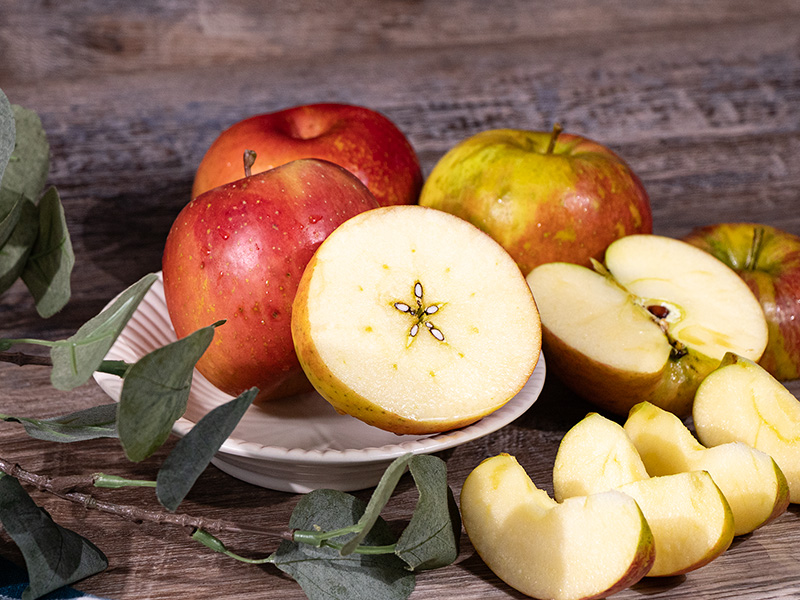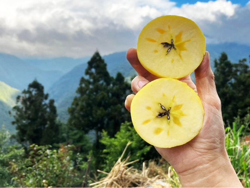 結蜜,是蜜蘋果愈挫愈勇的痕跡,沿著果核散布著晶瑩剔透的蜜腺,正是蘋果天生禦寒的本能。在海拔約2200公尺的高山,晝夜近10度的溫差,讓蘋果把澱粉轉化為果糖,果肉因此香甜脆口。這些蜜蘋果雖然外表樸實,不像進口品種鮮豔亮麗,但吃起來卻香脆多汁,甜滋滋得讓人停不下來。特別是在寒流後採收的果實,橫切後能在果核周圍看到放射狀的「蜜腺結晶」,有時還會帶著一圈淡綠色的蜜腺,口感同樣甜美誘人,一口就能嚐到高山獨有的滋味。