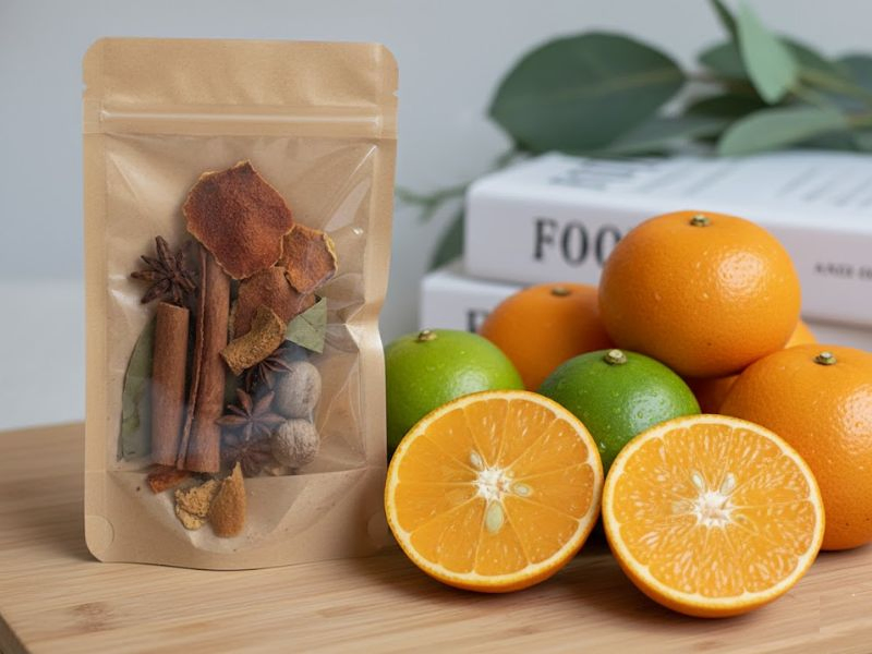 加入香料與果實: 放入一整包熱紅酒香料包。接著,將 2~3 顆砂糖橘切成圓片或對半,連皮一起放入鍋中(若喜歡更強烈的柑橘香,可先將橘皮稍微搓揉一下)。